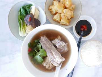'Pork Bone Tea'. Soft bone spare ribs simmered in a herbal & peppery soup with Napa cabbages, shiitake & goji berries. A Teochew classic, perfect for 2nd breakfast with fried dough stick. 'youtiao' & a pot of Oolong tea.