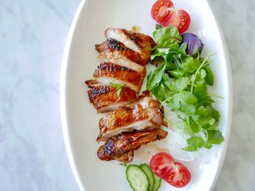 Lemongrass & cilantro marinated chicken thighs BBQ in a Kecap Manis glaze served on a herby salad in a sesame ponzu dressing topped with wonton chips.*More greens than pictured.