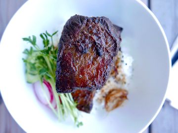 Sousvide then flash-grilled & served bistro style over a grilled rapini, fresh greens & herbs in a spicy Tiger-crying Jaew chili dressing. Gluten free