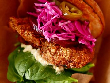 Inchi Kabin Captain's Burger. Nyonya turmeric fried chicken thigh on spinach & sambal aioli with kewpie-coconut milk duck egg mayo. Served with atchar (pickled vegetables).