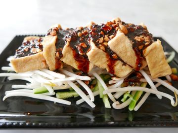 Fried Beancurd Served on a Bed of Fresh Beansprouts & Julienned Cucumber w a Sweet & Tangy Peanut Dressing.