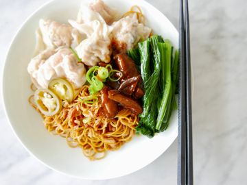 Hailing from Southern China's Canton region & popular in Southeast Asia, 6 of these pork & shrimp wraps are served over al-dente 'Hong Kong' egg noodle with a dollop of braised shiitake mushrooms, fresh greens & pickled jalapeños.